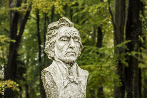 bust of Frederic Chopin against the background of leafy trees in a city park