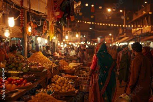 Bustling Evening Marketplace with Colorful Stalls and Exotic Goods