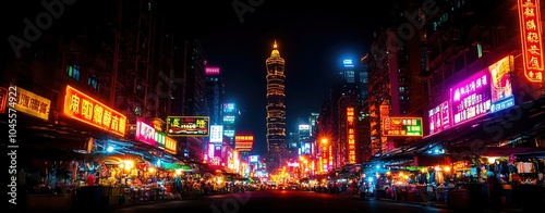 Bustling night market in an Asian city, with vibrant signs and stalls lit up, showcasing the rich culture and lively environment