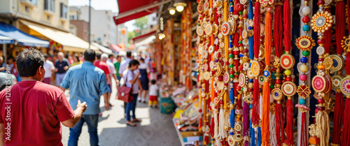 Bustling shoppers admiring rakhi stalls in vibrant bazaar, festive spirit