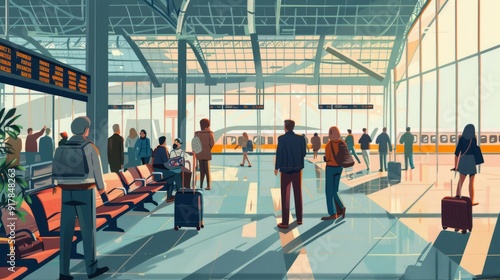 Busy airport terminal with travelers walking and waiting, large windows overlooking the runway with airplanes, people with luggage and backpacks in a modern travel hub, ideal for air travel, vacation,