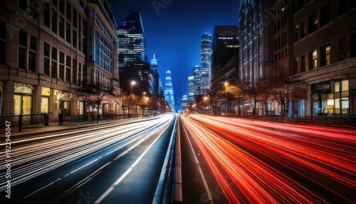 city, street, night, light, trail, vehicle, building, illuminated, tall, skyscraper, light, urban, road, traffic, motion, blur, red, white, blue, tree, sidewalk, car, lane, reflections, dark, night time, city landscape, downtown, architecture, modern, vibrant, dynamic, bustling, glowing, tied-up, moving, side, style, colours, pattern, visual, creative