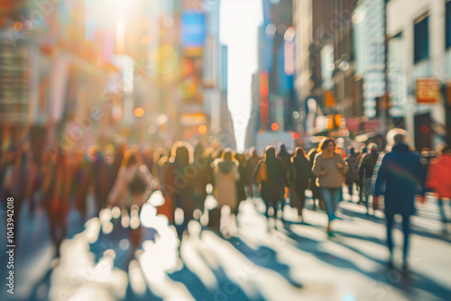 Busy city street with people walking and a blurry background. Scene is bustling and lively