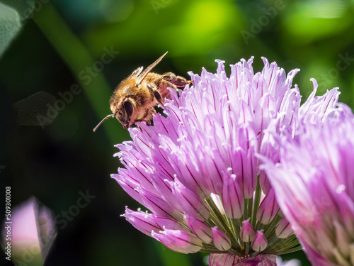 Busy Honey Bee sit on chives blossom with a violet color