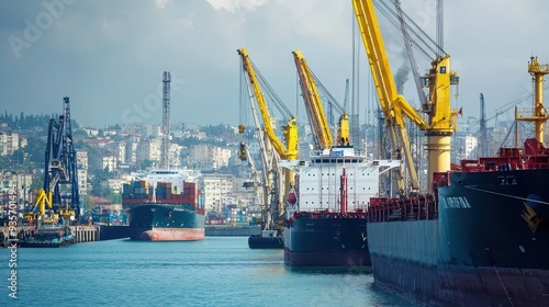 Busy port scene with large cargo ships and cranes, showcasing industrial activity and maritime logistics.