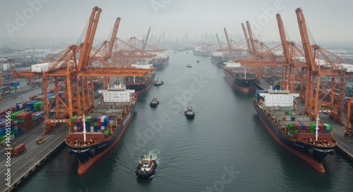 Busy port with large container ships docked along the piers, being loaded and unloaded by numerous orange gantry cranes, with smaller tugboats navigating the waterway