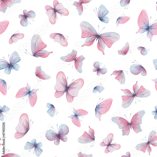 Butterflies are pink, blue, lilac, flying, delicate with wings and splashes of paint. Hand drawn watercolor illustration. Seamless pattern on a white background, for design.