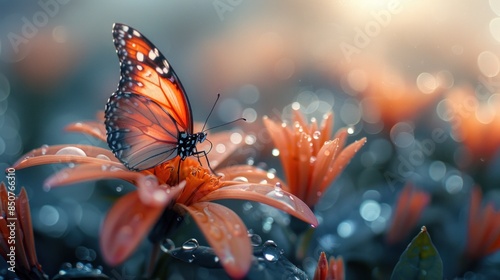 butterfly, monarch, orange, black, wing, lily, flower, dew, morning, bloom, garden, nature, macro, close, up, blurry, background, bokeh, sunlight, light, soft, sharpened, beautiful, colourful, delicate, fragile, insect, fauna, flora, wild, life, fresh, summer, spring