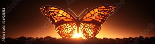 Butterfly silhouette with wings as stained-glass lattice, glowing light from behind, artistic nature concept