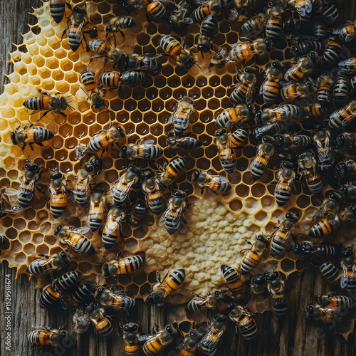 Buzzing harmony of bees working together to create sweet honey on a honeycomb in a peaceful outdoor setting