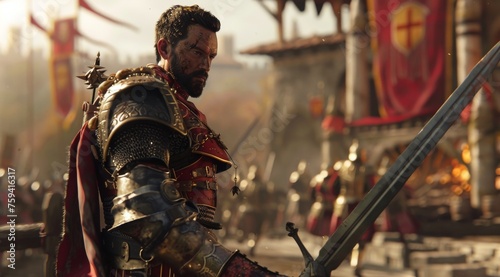 Byzantine man in a red armor holding swords in a sunlit area