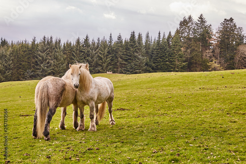 Caballo Escocés. Caballo blanco con pelo largo en una pradera extensa verde. Scottish horse White horse with long hair in a green wide meadow.