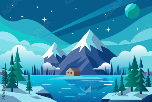 cabin, mountain, lake, snow, night, sky, star, pine, tree, blue, green, white, winter, cold, landscape, nature, peaceful, serene, calm, tranquil, wilderness, remote, isolated, dark, shadow, distant, horizon, abstract, illustration, graphic, art, digital, design