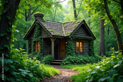 Cabin nestled in the heart of a dense thicket of bushes and vines, greenery, leaves, natural cycle