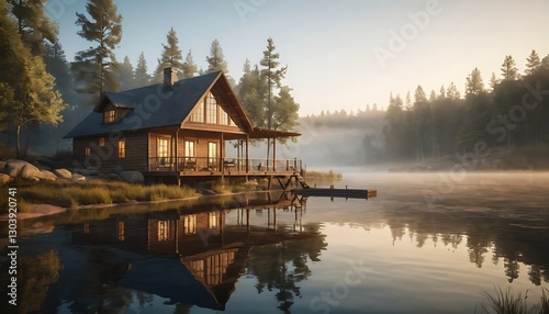 cabin, building, reflecting, lake, wood, exterior, house, architecture, tree, fog, reflect, water, calm, morning, landscape, nature, scene, mist, sunrise, tranquil, pier, dock, rustic, get-away, lakeshore, retreat, lifestyle, travel, idylli, peaceful, filed, pine, forest, foggy, vacation, serene, quiet, daybreak