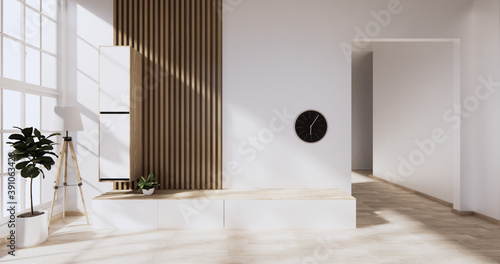 Cabinet wooden japanese design on living room zen style empty wall background.3D rendering