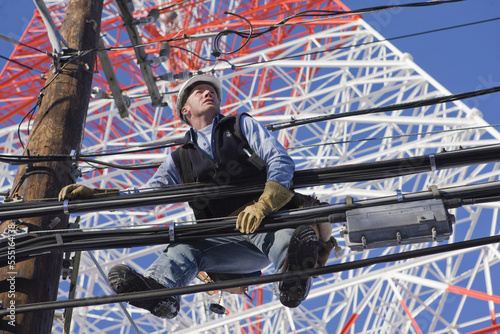 horizontal, protection, outdoors, day, industry, science, technology, expert, skill, balance, occupation, support, engineering, cyberspace, signal, communication, safety, electricity, repair, wire, working, tower, glove, labor, effort, television, expertise, restoration, radio, men at work, engineer, maintenance, cable, mechanic, network, photo, telecom, high technology, broadcasting, wireless technology, clear sky, microwave, one person, repairing, telephone pole, networking, looking up