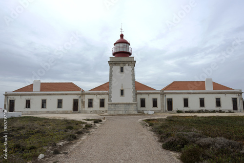 horizontal, sunny, lighthouse, red, famous, sky, outdoors, stone, day, landscape, summer, atlantic, western, culture, portuguese, view, exterior, travel, sand, europa, nautical, blue, landmark, tour tourism, location, clear, place, destination, dune, european, sea, nobody, white, tower, building, portugal, architecture, ocean, colours, over, national