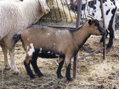 cabrita / cría de cabra color marrón junto a comedero y cabras adultas