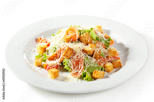 bread, caesar, cheese, cherry tomato, crouton, delicious, diet, dinner, dressed, fillet, fish, food, fresh, green, health, healthy, kitchen, leaf, lettuce, lifestyle, lunch, meal, meat, natural, oil, organic, parmesan, plate, eatery, romaine, salad, salmon, seafood, setting, tomatoes, vegetable, isolated, white background, nobody