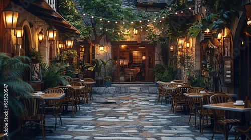 Cafe in the city at night, cobblestone street, tables and chairs with coffee cups on them, warm lighting from lanterns hanging above each table, vintage. Generative AI.