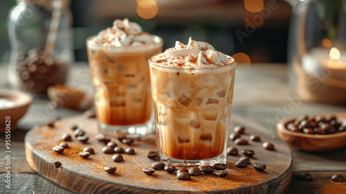 Cafe Table with Iced Coffee Lattes, Coffee Beans, and Whipped Cream