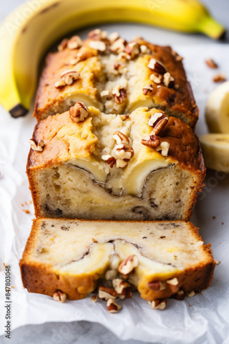 cake mix banana bread with chopped pecans inside, in a close up view from a low angle top down perspective, bananas in background, white marbled counter