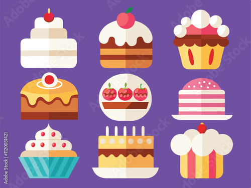 cake, cupcake, birthday, vector, sweet, dessert, food, chocolate, muffin, cream, illustration, set, cartoon, bakery, cherry, candy, cute, strawberry, party, cup, pink, pastry, celebration, pattern, fruit