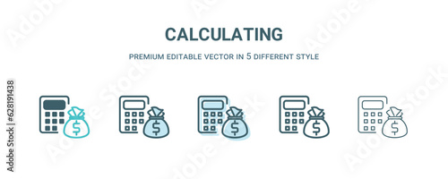 calculating icon in 5 different style. Outline, filled, two color, thin calculating icon isolated on white background. Editable vector can be used web and mobile