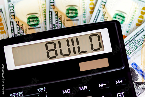 Calculator with text BUILD on the dollars. Business, finance conceptual.