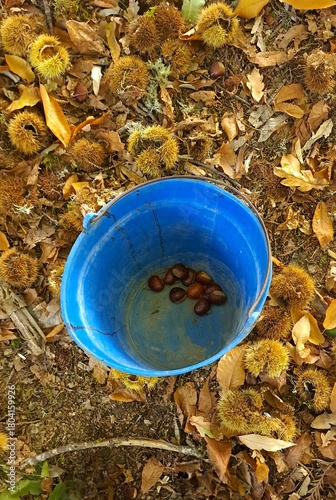 Caldero azul con castañas sobre suelo otoñal
