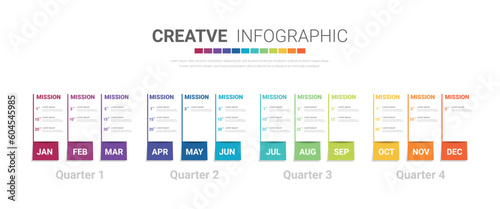 Calendar 12 months in 4 quarters, Infographic template for business 1 year can be used for annual report, workflow, process diagram, flow chart.