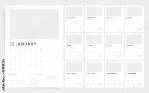 Calendar 2024, Set Wall Calendar Template Design with Place for Photo. Week Starts on Sunday. Set of 12 Months.