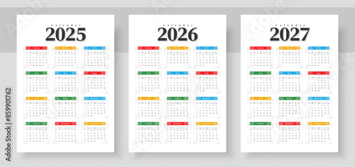 Calendar 2025, calendar 2026 and calendar 2027. Week start Sunday. Simple vertical calendar design template. Corporate design planner template. Organizer in English. Pocket or wall formats.