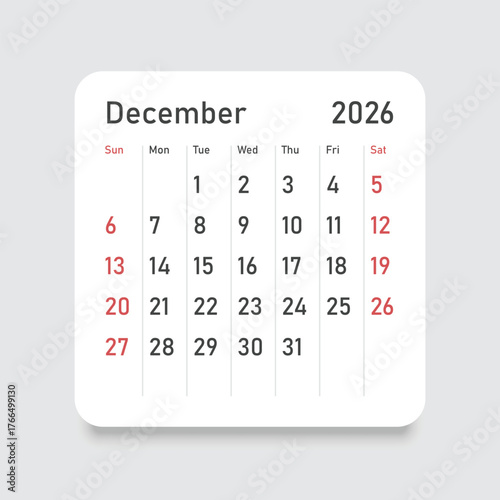 december, calendar, 2026, background, vector, business, month, design, office, date, illustration, table, wall, white, poster, template, planner, shadow, creative, geometric, flier, layout, graphic, desk, modern, cover, event, print, media, advertisement, english, printing, week, year, sunday, horizontal, annual, minimal, diary, monthly, organiser, schedule, simple