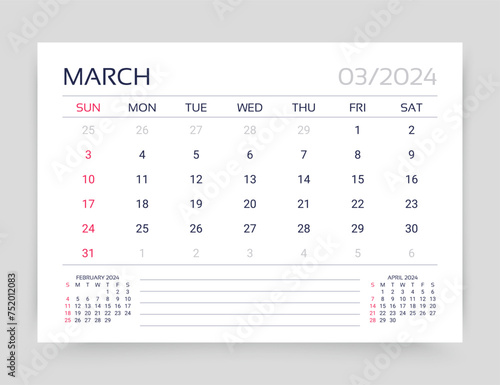 Calendar for March 2024 year. Planner calender template. Week starts Sunday. Desk corporate diary. Table schedule grid. Monthly organizer. Timetable layout. Vector simple illustration. Paper size A5