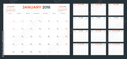 Calendar planner for 2018 year. Week starts on Sunday. Vector design print template