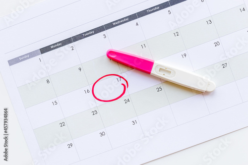 Calendar with pregnancy test, top view. Morherhood and pregnancy concept