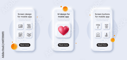 Calendar, Work home and Rating stars line icons pack. 3d phone mockups with heart. Glass smartphone screen. Paint roller, Marketing statistics, Winner ribbon web icon. Vector