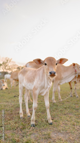 Calf in Pasture: A close-up captures an adorable calf with soft fur, standing gracefully in a sunlit pasture, other cows gather in the background. A symbol of new life in the natural environment.