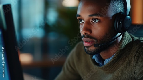 Call center agent attentively assisting a customer via headset. Featuring professionalism and communication