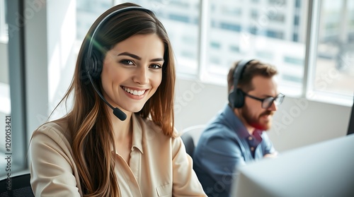 Call Center Agent in Office – Female CSR Wearing Headphones and Assisting Customers, CSR, agent in office, call center office