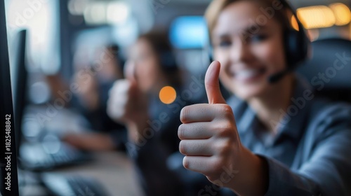 call center worker wearing headset gives thumbs up in busy office with teammates at computers, upbeat and supportive atmosphere