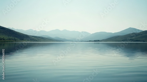 Calm and Serene Lake Reflection Surrounded by Mountains Under Clear Blue Sky in Soft Natural Light at Dawn or Dusk, Perfect for Tranquil Nature Themes