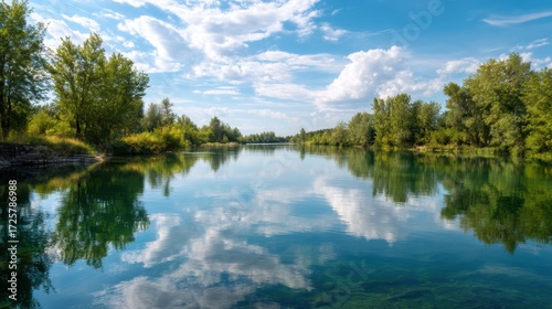 Calm clean lake reflecting blue sky and white cloud. Beautiful summer day outdoor for travel or vacation. Natural tranquil landscape.