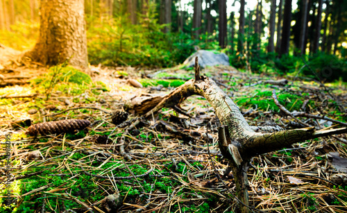 Calm cold morning in deep forest during sunrise