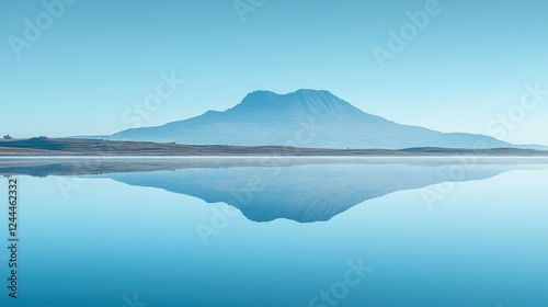 Calm lake reflecting mountain at dawn, serene landscape