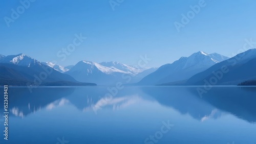 Calm Lake with Snow-Capped Mountains Under a Clear Blue Sky