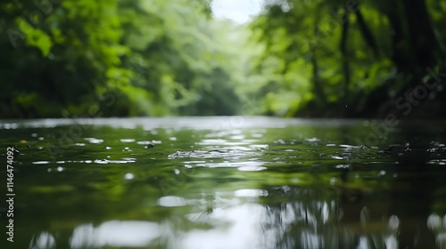 Calm river flowing through lush green forest.