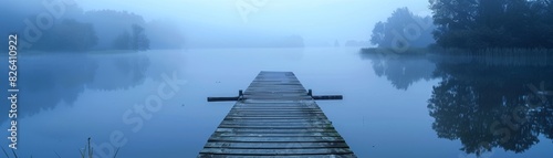 Calm river with a small wooden dock, mist rising in the early morning light, serene and peaceful atmosphere, ideal for relaxation and nature themes, isolated background.